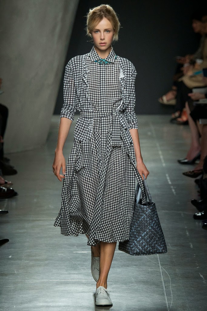 Bottega Veneta presenta una pasarela llena de sofisticación y elegancia, los cuadros vichi y las parkas se mezcla con las chaquetas deportivas, la cinturas marcadas, las asimetrías y volantes visten a una mujer segura y decidida la carta de colores naturales los negros, grises, nudes y rosas conviven con los estampados florales.